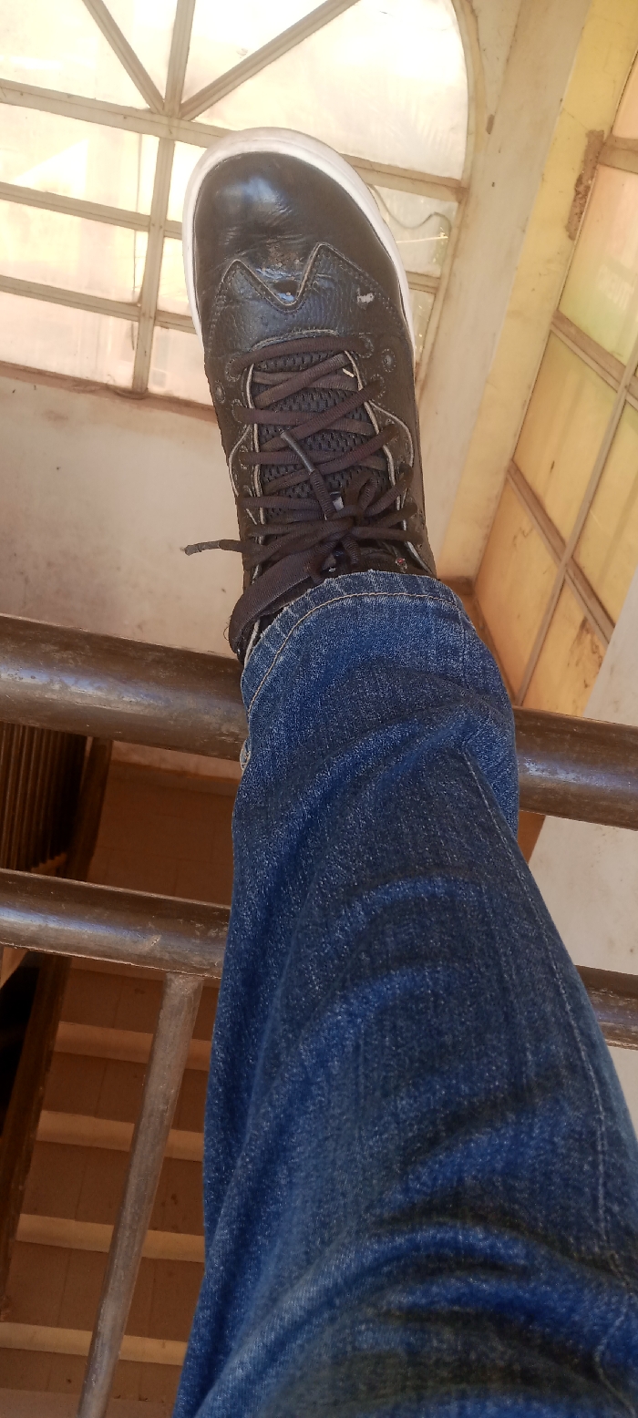 The image depicts a person's right leg, wearing blue denim jeans and a dark black or dark brown lace-up shoe featuring a white sole. The foot rests on a dark metal railing. One shoelace on the shoe is visibly frayed. Below the railing, a light-colored staircase descends. Above and behind, a translucent corrugated roof, supported by a framework, allows diffused sunlight. Segments of a light-colored wall are visible in the upper right. The scene is located in Sabon Tasha, Nigeria.