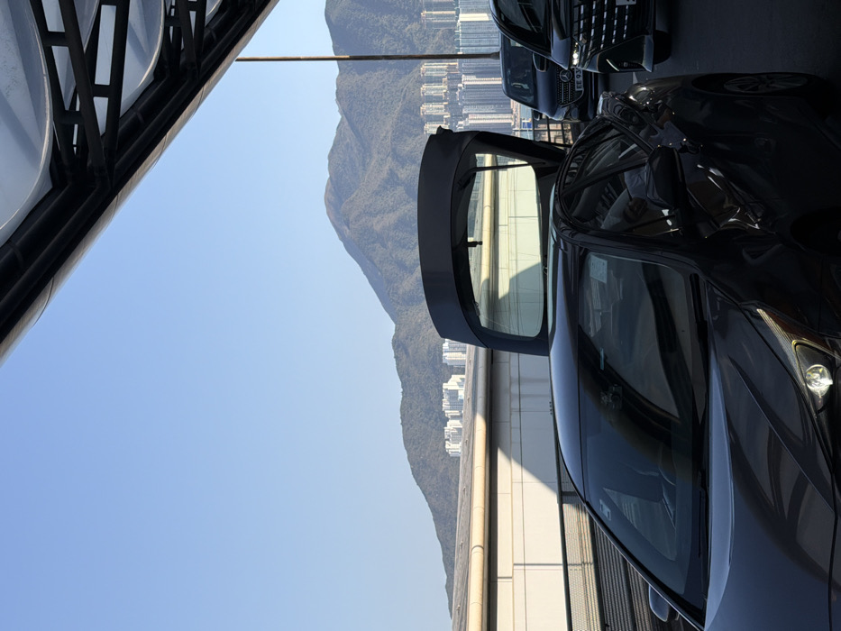 An outdoor scene captures an elevated road or bridge under a clear blue sky in Hong Kong. In the foreground, a dark-colored sedan with its rear hatch fully open occupies the left-center. The car's front passenger-side headlight is illuminated. A reflection of a person in a light-colored shirt is visible in the driver's side window. To the right and behind this vehicle, a black Mercedes-Benz van (license plate "EE 93") is partially visible, followed by another dark vehicle, indicating a queue of traffic. An overhead structural element with a translucent roof and dark metal framework diagonally spans the top of the frame, casting shadows onto the road and foreground car. A white concrete barrier with a dark metal railing runs horizontally across the midground, separating the road from the background. The background features a prominent range of green, undulating mountains under the bright sky, characteristic of Lantau Island. Numerous clusters of high-rise residential buildings are visible at the base and along the slopes of these mountains, particularly concentrated to the left and extending along what appears to be a coastline or bay to the right, consistent with urban developments like Tung Chung. The scene suggests the **Hong Kong-Zhuhai-Macau Bridge (HZMB) Hong Kong Port area**, looking towards Lantau Island.