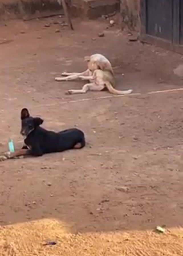 The scene features two dogs resting in a dirt-covered outdoor area. One dog, a black and tan breed, is lying down in the foreground to the left, with its head raised. Beside it is a small, blue object. The second dog, a lighter color (possibly white or tan), is resting in the background, on its side, licking its hind leg. The environment appears to be a courtyard or open space near buildings, characterized by a dirt surface and surrounding walls or structures made of red brick or concrete. The lighting indicates it is daytime.