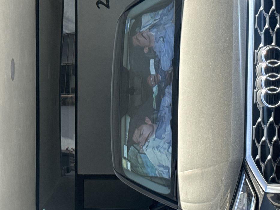 An upside-down medium shot captures the front passenger side of a gray Audi. The car's grille, adorned with the Audi logo, is prominent. The windshield reflects an interior scene with what appears to be a person or people inside, although details are obscured. The car is parked next to a light gray building or wall that features a dark gray vertical accent.