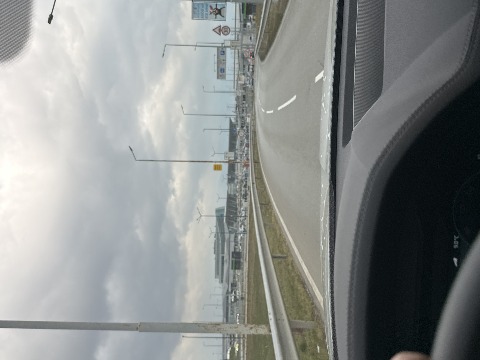The image captures a view from inside a vehicle, looking forward through the windshield toward Sofia Airport Terminal 2 under an overcast sky. **Location:** The scene depicts the approach road to Sofia Airport Terminal 2, located in Sofia, Bulgaria. The distinctive multi-story building with a large, curved dark grey roof and extensive glass facades in the background is identifiable as Terminal 2. **Environment:** The sky is heavily overcast with dense grey clouds. The road surface appears damp, and small water splatters are visible on the vehicle's windshield and dashboard, suggesting recent precipitation or road spray. **Foreground (Vehicle Interior):** The lower portion of the image shows the top of a dark, leather-wrapped steering wheel with visible stitching, partially obscured by a hand on the left. A dark dashboard with textured surfaces and stitching extends across the bottom. A digital display within the dashboard shows "90°C" and "2:06", likely indicating engine temperature and time. **Midground (Road and Infrastructure):** A two-lane asphalt road, partially visible, curves gently to the right in the distance. White dashed lines mark the center of the visible lane. A metal crash barrier (guardrail) separates the road from a grassy median strip on the left. Numerous tall, grey streetlights line the road and extend into the background. A large white pole stands prominently on the left. On the right, a pole displays several road signs, including a circular speed limit sign indicating "30" km/h, and another sign with a cartoon reindeer-like figure and partially visible text, likely airport-related. **Background (Airport Complex):** Beyond the grassy median and crash barrier, numerous vehicles are parked in various lots and on access roads leading to the main terminal building. The modern, grey and glass structure of Sofia Airport Terminal 2 dominates the background. No specific individuals or their actions are clearly discernible within the scene.