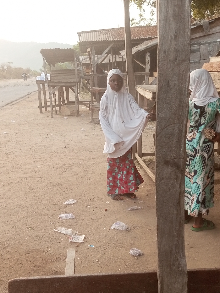Two young girls wearing hijabs stand outside. One wears a white hijab with a red and green patterned skirt, while the other has a similar white hijab and a teal patterned dress. Trash litters the ground around them. Behind them are wooden structures, possibly market stalls, and a glimpse of a road with a motorcycle. The scene appears to be a rural or developing area.