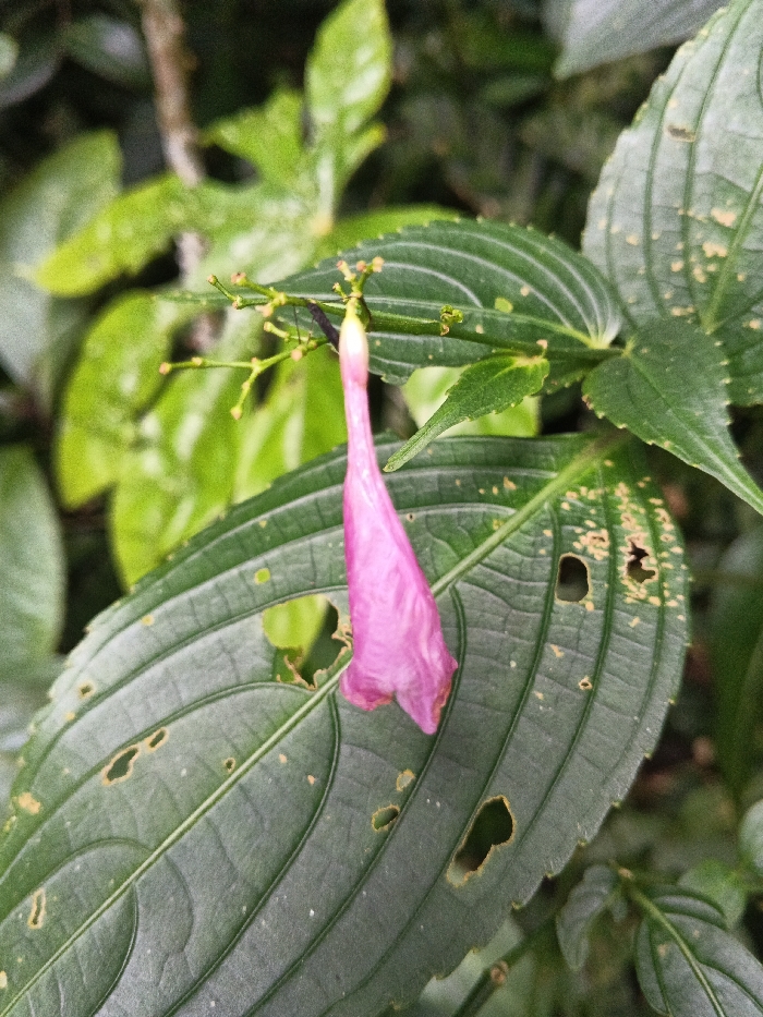 A close-up photograph, taken in Tây Ninh, Vietnam, captures a single, elongated, pink flower bud, approximately 6-7 cm in length, suspended from a thin green stem with multiple smaller, nascent green buds. The pink bud tapers to a lighter, almost white tip where it attaches to the stem, and its lower portion exhibits a slightly crinkled appearance, suggesting either a wilting state or an unopened bloom. Dominating the mid-ground behind the flower is a large, dark green leaf with prominent parallel venation. This leaf displays numerous irregular perforations and scattered yellowish-brown discolorations, indicative of environmental damage or insect activity. The background consists of out-of-focus green foliage, creating a dense, natural setting under diffused lighting conditions.