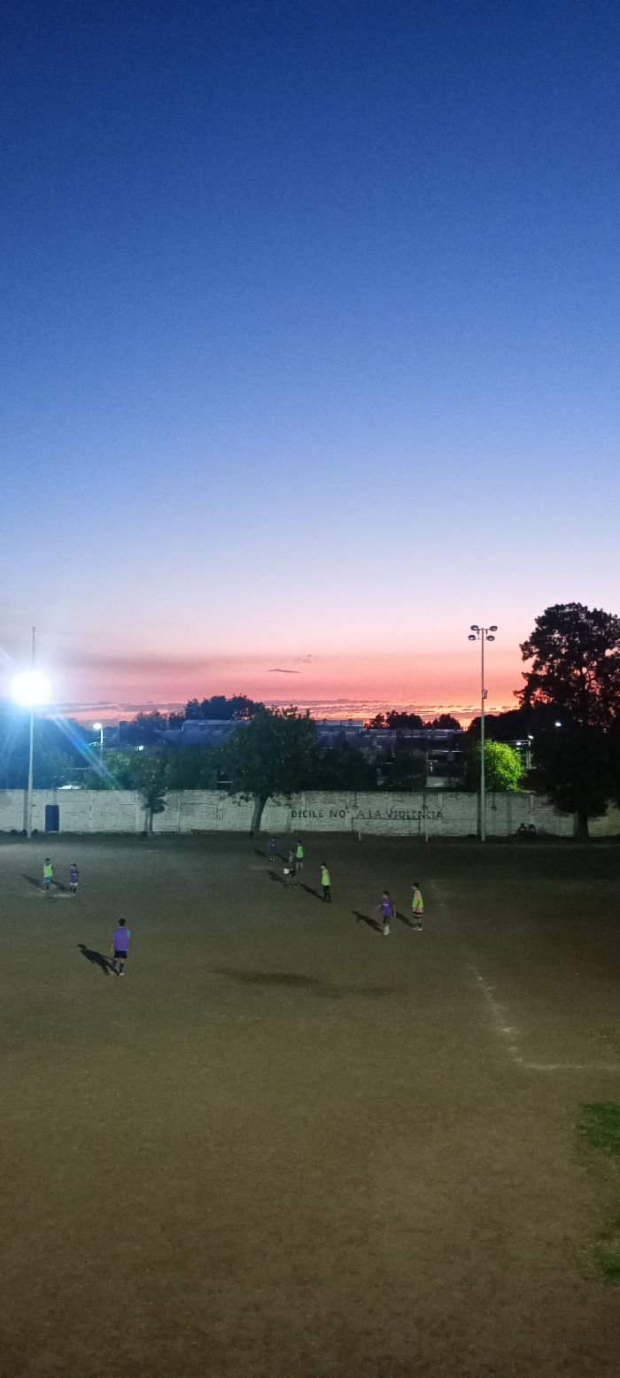 A soccer field at dusk with players in jerseys. A white wall in the background reads "DECICLE NO A LA VIOLENCIA" in dark lettering. The sky transitions from blue to pink near the horizon. Trees line the background with buildings visible behind them. Two tall light posts illuminate the field. The ground is uneven with sparse grass.