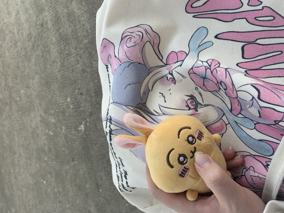 The scene depicts a close-up, downward-angled view of a human hand holding a plush toy over a light-colored garment, with a concrete surface visible in the background. The location is Virpazar, Montenegro. A light-skinned hand, with a visible thumb and index finger, grips a small, round, light orange/yellow plush toy. The toy features soft, short-pile fabric, two prominent pink-lined ears, and embroidered facial details including black arched eyebrows, wide black eyes, a small "U"-shaped mouth, and two pink horizontal blush marks on each cheek. Beneath the hand and plush toy is a cream or off-white fabric surface, likely part of a hoodie or bag, displaying a large, stylized graphic design. The design features an anime-style character, possibly a rabbit or a girl with rabbit-like features, rendered in pastel shades of light blue, purple, and pink. Elements resembling flowing hair, ribbons, and flowers are visible. Partial, illegible text in a decorative script is also present on the fabric, both behind and partially below the character graphic, with large pink letters visible at the lower right corner. The upper portion of the image reveals a grey, textured concrete surface, consistent with pavement or a floor, showing subtle variations in tone and minor speckled patterns. The lighting is even, suggesting ambient daylight.