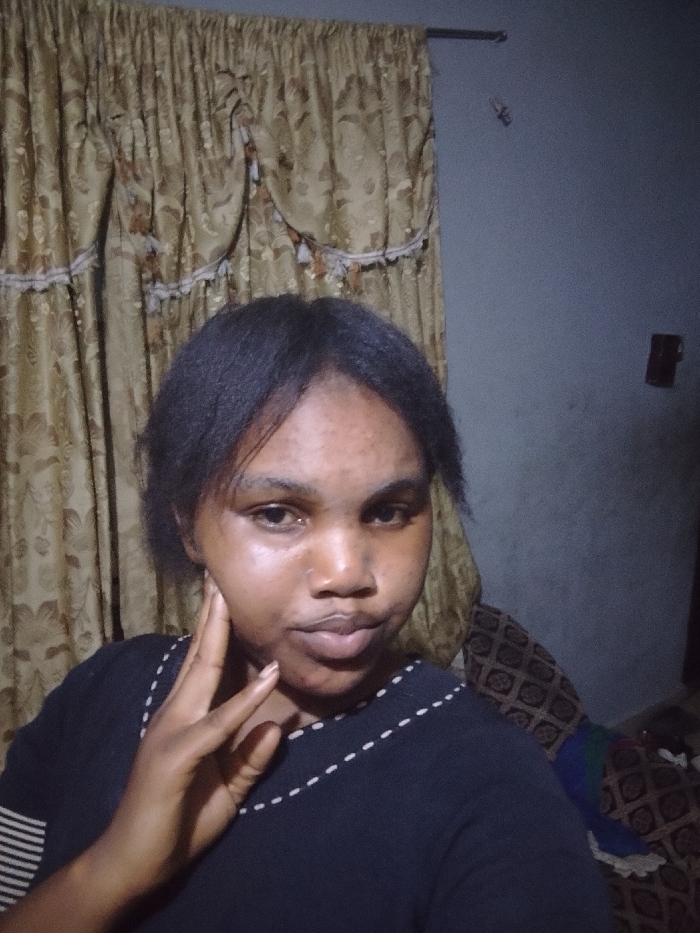 The image displays an indoor scene in an unknown city and state. A young adult female, of medium-dark complexion with dark, textured hair, is centrally positioned, facing the camera directly. She wears a dark-colored garment with a V-neck or boat neck featuring white dashed stitching, and a striped sleeve on the left side of the frame. Her right hand is raised, with fingers spread, lightly touching the right side of her jawline. The background on the left is dominated by a gold-toned curtain with a repeating floral pattern and a decorative valance featuring white trim. The background on the right consists of a plain, light grey wall. A small, dark, indistinct object is adhered high on the right wall, and a dark rectangular object is mounted lower on the same wall. In the lower right corner, a portion of upholstered furniture, possibly a sofa or chair with a brown geometric pattern, is visible, along with a folded blue and green textile resting on it. The scene is dimly lit, casting soft shadows.