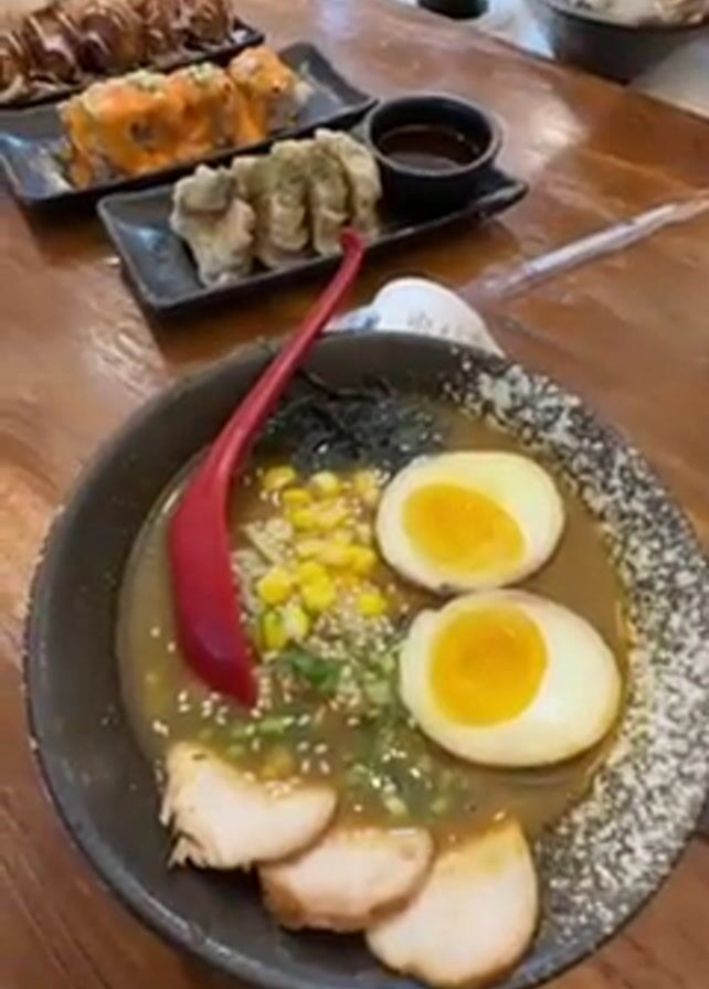 wooden table in a restaurant setting. On the table, there is a bowl of ramen with a red spoon, sliced meat, two halved eggs, corn, seaweed and green onions as toppings. There are also three plates of sushi and dumplings arranged behind the ramen bowl, along with a small dish of soy sauce. In the background, there are more tables and chairs, as well as another bowl of ramen. A person is visible in the upper right corner.