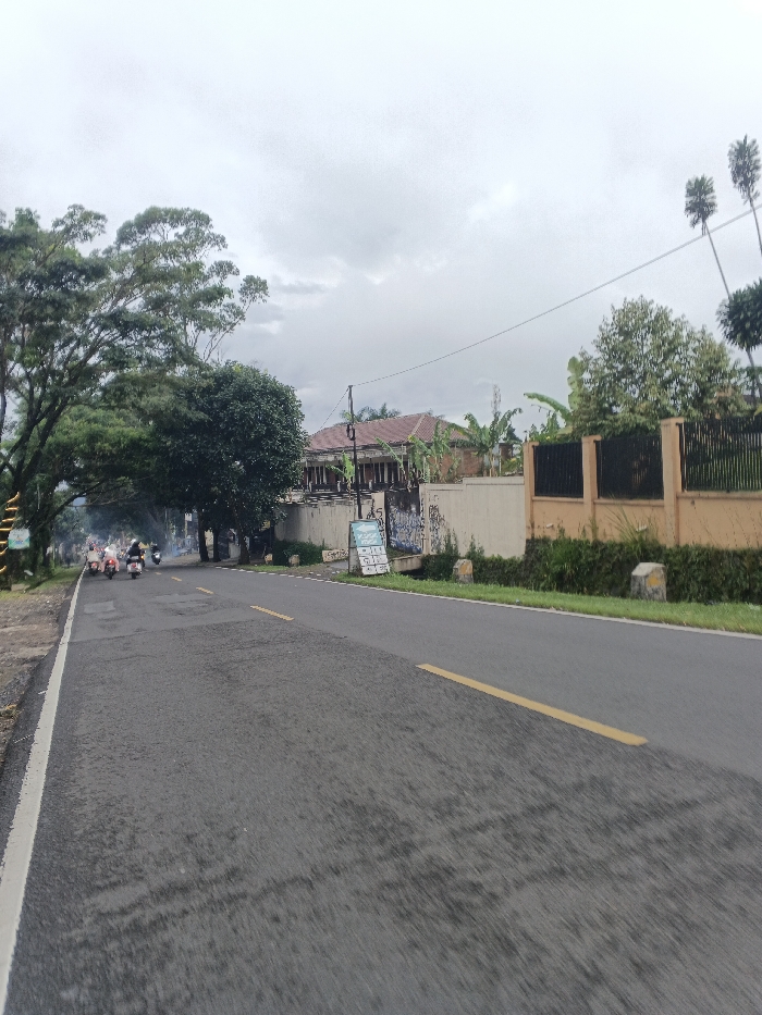 The scene depicts a street view in Kadoma, Zimbabwe, under an overcast sky. A dark asphalt road dominates the foreground, featuring a solid white line on its left edge and a double yellow centerline (one solid, one dashed) indicating traffic flow. The road surface shows areas of wear and patching. On the left side of the road, a line of mature trees with dense green foliage forms a partial canopy over the street. Approximately five to seven motorbikes or scooters, each with a rider, are traveling away from the viewer on the left lane, emitting visible exhaust fumes. Further down the road on the left, more trees and utility poles are discernible. The right side of the road features a manicured strip of green grass and bushes, bordered by a low, light-colored concrete wall. Two small, light-colored concrete markers are positioned at the edge of the road near the wall. Behind this lower wall, a taller, beige-painted concrete wall with a black metal fence on top runs parallel to the road. Leaning against this wall is a light blue sign with white text and graphics. Sections of the wall appear to have graffiti. Beyond the wall, a building with a prominent brown-tiled roof and columns along its facade is visible. Tropical vegetation, including banana trees, grows around the property. Overhead, utility lines traverse the frame against the cloudy sky.