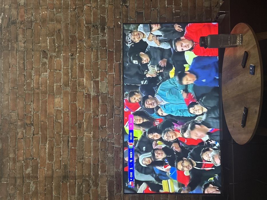 A flat-screen television displays a soccer match, dominating the lower center of the frame against a textured red-brown brick wall