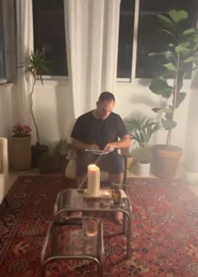 A man is seated on a chair in a room filled with plants, writing in a notebook. A candle burns on a glass table in front of him. He is wearing a black t-shirt and shorts. A Persian rug covers the floor, and white curtains hang in the background.