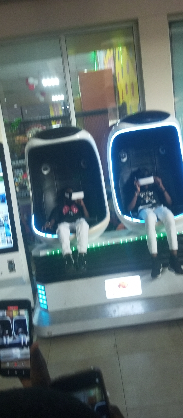Two children sit in a virtual reality ride at an indoor location. The rides are white and black with glowing blue and green lights. The children wear VR headsets and white pants. A hand holding a phone, showing the VR rides on screen, is visible in the foreground. The background shows a store with shelves and a window. The photo is taken at a slightly tilted angle and appears to be taken with another phone camera.
