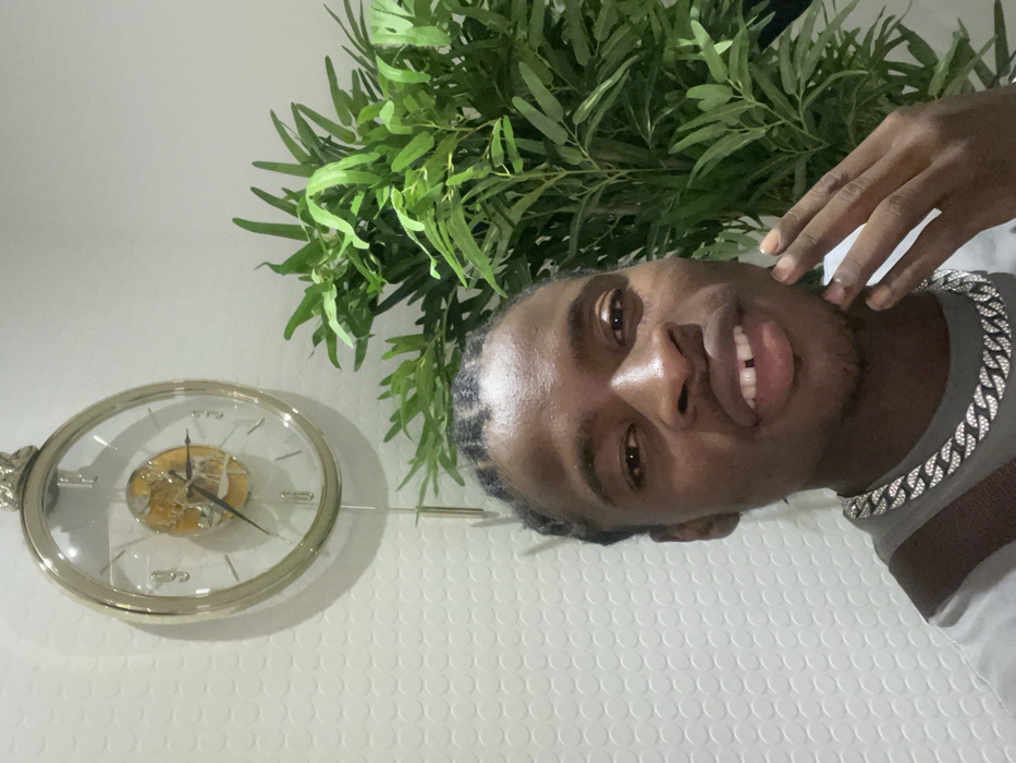 A man with dark skin and braided hair smiles into the camera. He wears a sparkling chain necklace and a grey shirt with a brown stripe. Behind him is a white wall adorned with a decorative plant and a clear-faced pendulum clock with gold accents. The image is taken from a slightly low angle, making the subjects and objects appear larger and filling the frame.