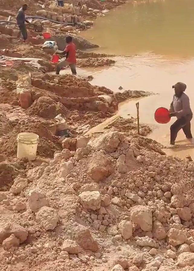 The scene depicts a clay pit with a small pond of muddy water, where several individuals appear to be working. Two men in the foreground are seen wading in the shallow water, using red buckets to scoop and move the sediment. The landscape is a mix of loose soil, rocks, and muddy patches, suggesting a work-in-progress environment. Further away, more people can be seen working near the pond, and a yellow excavator sits on a higher elevation. The ground is predominantly red-brown, indicating a clay-rich soil type. There are also buckets, sacks, and pipes scattered throughout the scene.