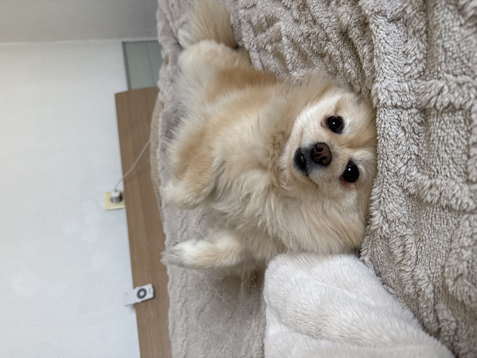 - "This image, taken in a bedroom within Razlog, Bulgaria, displays a light-colored, fluffy dog, likely a Pomeranian, lying on its back on a textured, beige, fluffy blanket" by FM-CCOQt1, licensed under CC BY 4.0