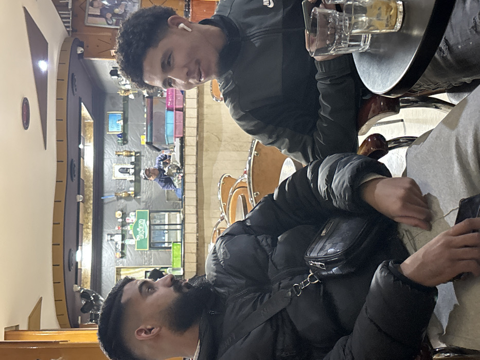 Two men sit at a table in a restaurant. The first man has a beard, wears a black puffer jacket, and holds a phone. The second man, wearing a dark Nike jacket and an earbud, looks at the first. Glasses with liquid sit on the table. Behind them, the restaurant interior shows a bar with decorations and someone working behind it. The wall has a wavy design with ornaments.
