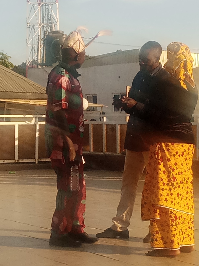 Three individuals are positioned on an elevated, light-colored outdoor surface, possibly a rooftop, in Jos, Nigeria. On the left, a male figure wears a full-body patterned ensemble in red, green, and dark hues, topped with a light-colored, conical or dome-shaped hat adorned with white feathers. He holds a clear plastic water bottle in his left hand. The central figure, a male, wears a dark long-sleeved shirt and light-colored trousers; he is observed looking down at his clasped hands, which hold a small, dark rectangular object. The figure on the right, a female, is viewed from the back, wearing a bright yellow wrapper skirt with a red star pattern and a dark top, with her bare feet or flat sandals visible. The background features a white building with visible windows, a building with a corrugated metal roof, and a prominent white communications tower. A dark green water tank is situated on a rooftop, and a white balloon floats near the railing structure that separates the foreground from the midground buildings. The scene is illuminated by natural daylight.