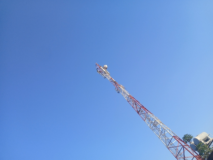 A low-angle shot shows a tall, red and white lattice telecommunications tower against a clear, bright blue sky