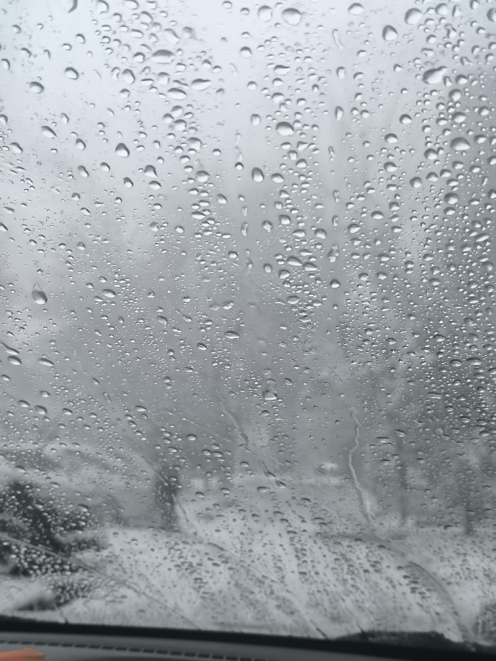 The image depicts a first-person view from inside a vehicle, looking through a windshield heavily covered in numerous clear water droplets of various sizes