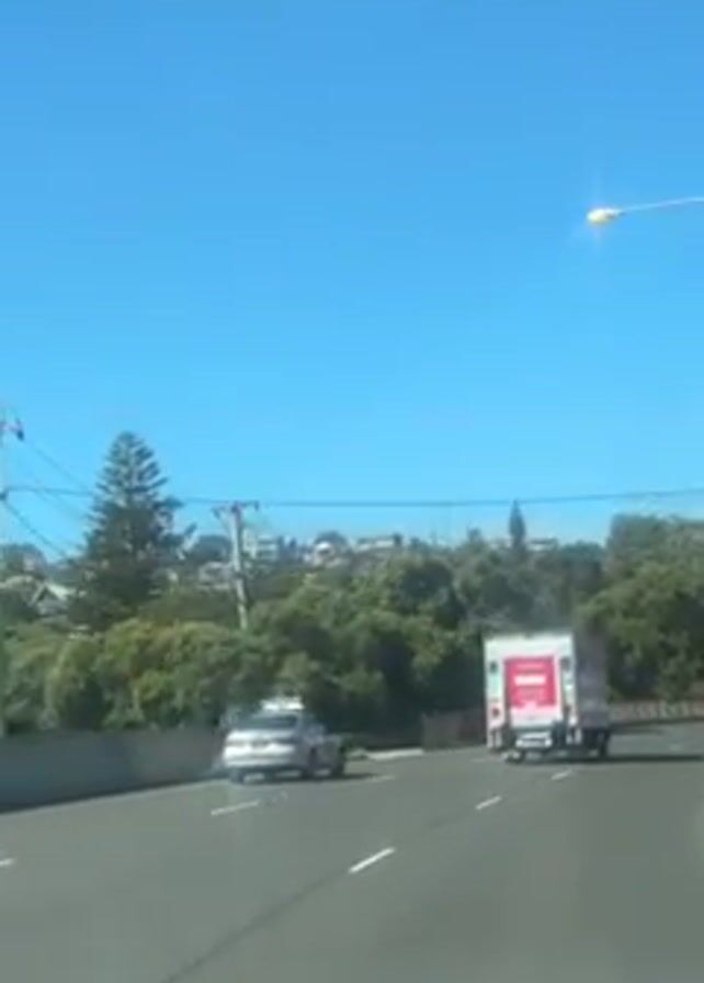 The view is from inside a vehicle driving on a multi-lane highway on a bright, sunny day. A silver sedan and a white box truck with a red graphic are ahead in the same lane. The highway is elevated with green vegetation and houses visible on a hillside in the background. A street light is visible on the right.