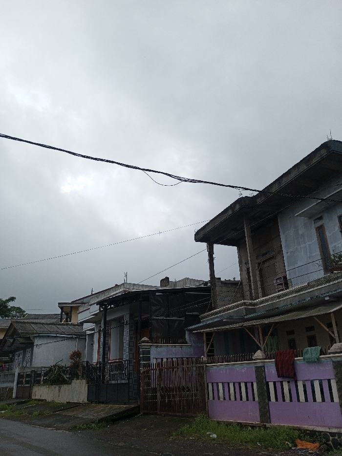 The image depicts a residential street scene in Ambakirano, Madagascar, under an overcast sky. The foreground features a dark, possibly asphalt or dirt, road with patches of green weeds and soil. Along the right side of the road, a low concrete fence with alternating purple and white vertical stripes is visible, adorned with a dark red and a light green cloth hanging over it. To its left, a rustic dark brown wooden gate provides access to a property. Beyond the fences, a series of houses line the street. The building closest on the right is a two-story structure with unpainted gray walls, featuring a prominent flat-roofed balcony on the upper level supported by thick concrete pillars. Brown-framed windows are visible on both stories. A lower, sloped roof extends from the main structure, supported by wooden poles over what appears to be a ground-level patio area. Utility lines, consisting of multiple dark cables, span horizontally across the upper portion of the image, running above and between the buildings. Further left, additional residential structures are visible, characterized by varied roof types, including corrugated metal and tiles, and predominantly muted color palettes. No individuals are present in the scene, and no overt actions or interactions are depicted. The overall environment suggests a quiet, potentially damp residential area.