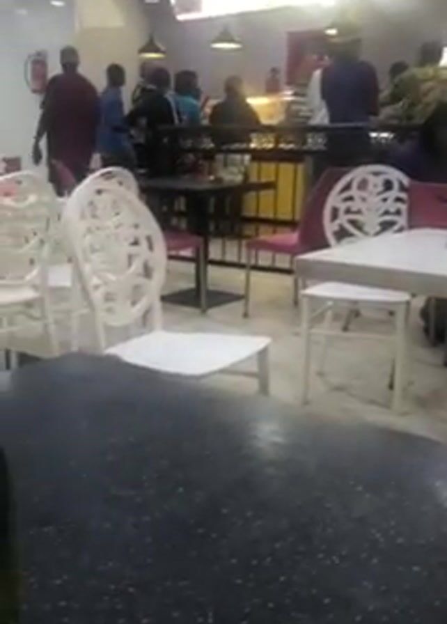 interior of a brightly lit fast-food restaurant. Several people are visible near the counter at the back, appearing to place orders or wait for food. The dining area is furnished with black-topped tables and chairs of different colors including white and pink. One person in a white shirt and hat sits at a table and appears to be using their phone. Another person sits at the same table. The camera is stationary, offering a view from another table in the foreground.