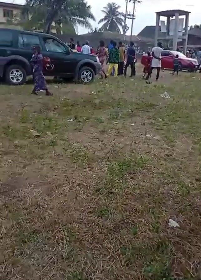 n outdoor setting with a grassy field and a group of people gathered. There is a dark green SUV parked on the left side of the frame. People are dressed in a variety of clothing, some in casual attire, and others in more formal or traditional wear. Some of the people are milling about, walking and interacting with each other. A small child in patterned clothing stands in the foreground, holding a small object. In the background, a red car is visible, and there is a concrete structure resembling a tower or observation post. The scene suggests a gathering or event in a rural or semi-rural location. The sky is overcast, and the overall atmosphere is relaxed.