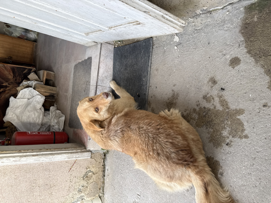 An outdoor scene in Varna, Bulgaria, depicts a medium-sized dog positioned on a concrete surface. The dog, predominantly light brown/golden with a darker patch of fur on its back, is sitting, facing away from the viewer, but has turned its head to look back over its left shoulder with blue-green eyes. Its right front paw is extended onto a dark, ribbed doormat situated at the entrance of a doorway. The concrete ground exhibits multiple dark, wet-appearing stains and scattered debris. To the left of the doorway, a textured, light-colored wall shows signs of wear. The doorway itself features a weathered, light-colored wooden frame with peeling paint. Inside the doorway, a tiled floor is visible, along with a second, larger dark doormat. A red fire extinguisher stands upright against the left interior wall. Adjacent to it, a pile of white tarp-like material is stacked, behind which wooden planks or logs are visible. A large, dark object, possibly a piece of furniture, leans against the rear interior wall. Another entryway is discernable in the far background of the interior space, with a white bag hanging nearby. To the immediate right of the dog and extending to the edge of the frame, a partially open, white-painted wooden door, also showing significant wear and peeling paint, is visible. The scene is illuminated by natural light.