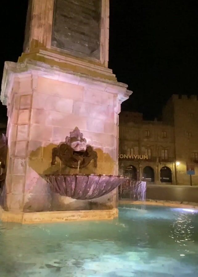 A nighttime shot shows a stone fountain in a plaza. The fountain's central structure is a rectangular pillar with a dark plaque at the top. Below the plaque, water flows from a lion's head spout into a large, scallop-shaped basin. The fountain is illuminated with a soft pink light, and the water in the basin reflects the light, giving it a greenish-blue hue. In the background, a building with the word "CONVIVIUM" above its entrance can be seen.