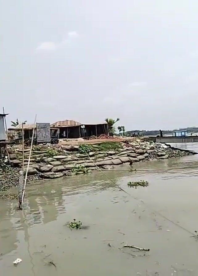 The video depicts a river scene on an overcast day. The river water is murky, and there are small patches of vegetation floating on the surface. Along the riverbank, there are several makeshift buildings, some elevated on stilts. The bank is reinforced with rows of sandbags. Closer to the foreground, there is a small wooden boat and a fishing net set up. As the video progresses, the camera pans to the right, revealing a ferry with people on board. Two additional ferries are docked nearby. The ferries are large, white and blue, and are connected to the riverbank by a metal ramp.