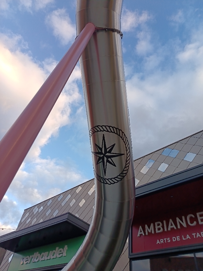 The image displays an outdoor scene in the city of Unknown, Unknown, featuring architectural and structural elements under a partly cloudy blue sky. A large, curved, silver-colored metallic tube occupies the central and right portions of the frame, extending from the bottom-center upwards. A black graphic depicting a compass rose enclosed within a circular rope pattern is present on the tube's surface. A pink, angled support beam is attached to the upper section of the metallic tube via a metallic ring. In the background, two building facades are visible. The left building features a dark, sloped roof or upper facade with a pattern of alternating matte and reflective square panels, and a green lower facade bearing the white text "vertbaudet." The right building exhibits a similar dark, patterned roofline and a red sign with "AMBIANCE" and "ARTS DE LA TABLE" in white lettering. No individuals are present.