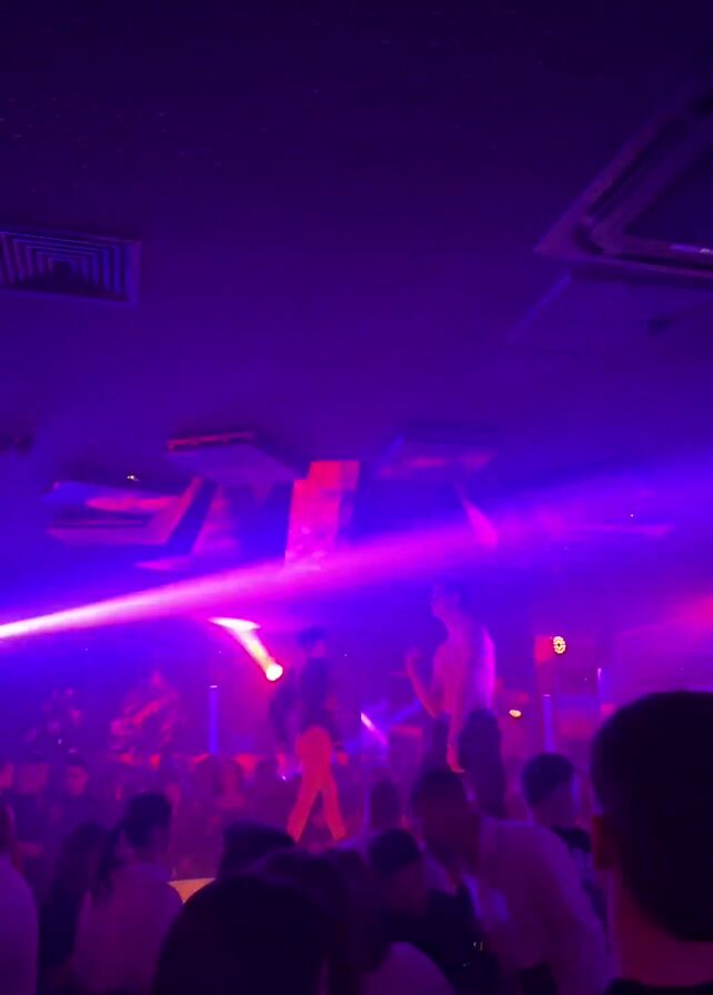 crowded nightclub with colorful lights. Two shirtless men wearing pants are dancing on an elevated platform in the middle of the dance floor. The lighting is predominantly red and purple, with beams of light shining over the dancing crowd. The club is packed with people, many of whom are facing the stage, presumably watching the dancers. The interior has a modern design with unique ceiling fixtures.