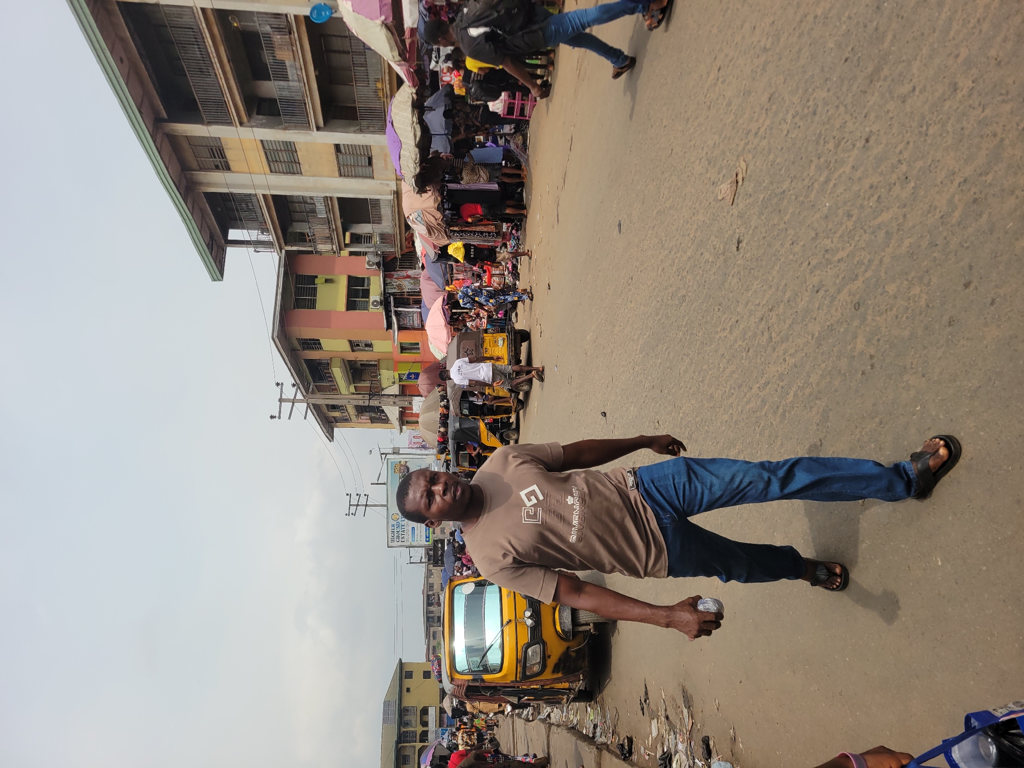 The image depicts a bustling street scene in Onitsha, Nigeria, under an overcast sky. A dark-complexioned male, appearing to be in his 30s-40s, walks directly towards the viewer, slightly right of the frame's center. He wears a brown short-sleeved t-shirt with a white graphic (including what appears to be "GIVENCHY"), blue denim jeans, and black flip-flops. He holds a crumpled clear plastic bottle in his right hand. To his left, a yellow auto-rickshaw (keke Napep) is parked near a curb, which is littered with debris including paper, plastic, and discarded footwear. Further down the street on the left, other people and additional keke Napeps are visible amidst market activity. A person's arm and a blue reusable shopping bag are partially visible in the bottom left corner. On the right side of the street, another male with a dark backpack walks away from the camera. Beyond him, numerous market stalls are set up, covered by various colored umbrellas (pink, purple, beige, brown) that shade vendors and merchandise. Groups of people are gathered around these stalls. Several other keke Napeps are parked or moving further down the street among the market activity. Multi-story buildings line both sides of the street. The building on the left features light green and pink sections. The building on the right is yellow and gray with visible balconies. Utility poles with power lines are present, and a billboard is partially visible in the distance. The asphalt road surface is worn, dusty, and shows signs of cracks and scattered debris.