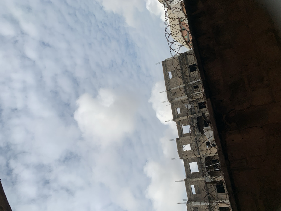 A low-angle, upward-looking photograph depicts a partially cloudy sky over an urban landscape in Enugu, Nigeria. The top approximately 60% of the frame shows a blue sky with scattered white cumulus and stratocumulus clouds. The lower 40% of the image is dominated by architectural elements. In the immediate foreground, a dark, textured concrete or block wall runs horizontally across the bottom 20% of the frame. Coiled razor wire is installed atop this wall, extending across its full visible length. Behind this barrier, a multi-story, unfinished concrete block building is visible. This structure features multiple rectangular window and door openings across its facade, and exposed steel reinforcement bars (rebar) protrude upwards from the top level, indicating ongoing construction or preparation for additional stories. To the far right, a portion of another building, appearing to be a completed structure with a light orange or pink exterior and a dark roof, is partially visible behind the unfinished construction. No people, subjects, or actions are depicted in the scene.