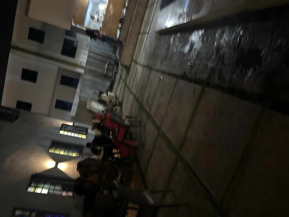 An outdoor space at night with tables and chairs is adjacent to a building with several illuminated windows. Some people are visible near the tables. The ground appears to be paved with rectangular stones or slabs with vegetation in between. A wet surface is visible in the upper right corner, possibly due to rain. The image is slightly blurred and angled, making it difficult to see finer details.