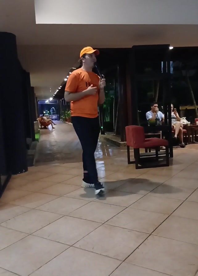 A person wearing an orange shirt, black pants, and a matching orange baseball cap is singing into a microphone while standing on a tiled floor in what appears to be a hotel lobby or public space. To the right, people are seated in red chairs at tables, and beyond them is an outdoor area visible through large openings. To the left, there is a corridor leading to another area with additional seating. A laptop is visible in the bottom left corner of the frame.