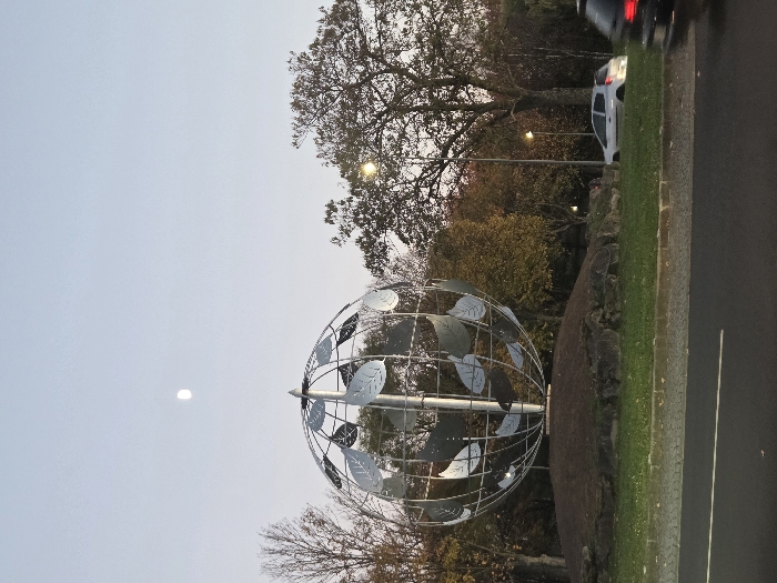 This image depicts a roadside scene in Tremblay-en-France, France, at dusk or early evening. The central subject is a large, spherical metal sculpture composed of a structural framework and numerous metallic, leaf-shaped panels, positioned on a raised, dark earthen mound within a grassy median or roundabout. The mound's base is lined with visible rocks. In the immediate foreground, a dark asphalt road with a solid white line is visible, running horizontally across the bottom of the frame. A narrow strip of green grass separates the road from the central island containing the sculpture. To the right of the sculpture, behind the grassy area and near a cluster of trees, a white hatchback vehicle is partially visible, appearing either parked or slowly moving. Further right, in the foreground on the road, a dark-colored vehicle is in motion, indicated by motion blur. Multiple streetlights are present, with at least two emitting artificial light. The background is dominated by a dense cluster of deciduous trees displaying autumn foliage, with leaves in shades of yellow, orange, and brown. The upper portion of the image shows a pale, clear sky with a prominent waxing crescent moon visible in the upper-left quadrant. No people are present in the scene.