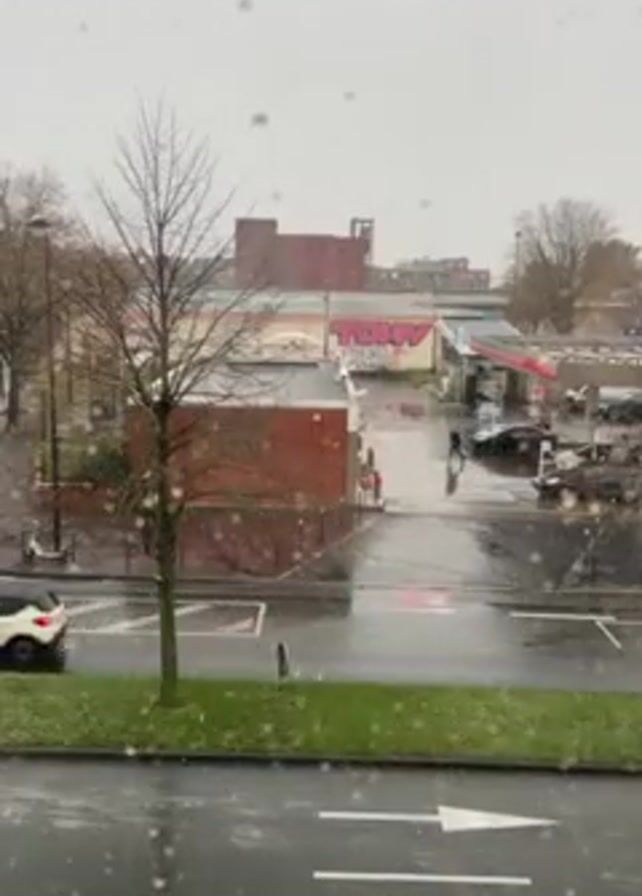 view from a window overlooking a wet street. It's snowing lightly. A white car is parked near a small tree. Across the street is a gas station, and a person is walking in that direction. In the background, a building has the word "TORCY" spray painted on its side. The overall scene appears to be an urban environment on a bleak day.