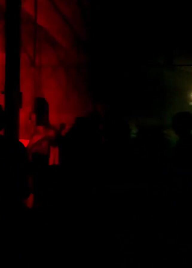 crowded dance floor, illuminated by colorful strobe lights. People are dancing and moving around, though their faces are indistinct due to the lighting and distance. The environment appears to be an industrial space with exposed ceiling fixtures and metal railings, suggesting a warehouse or similar type of venue. The lighting alternates between green, red, and white, adding to the energetic and dynamic atmosphere of the scene. There are large speakers suspended from the ceiling, and the overall impression is that of a rave or a dance party.