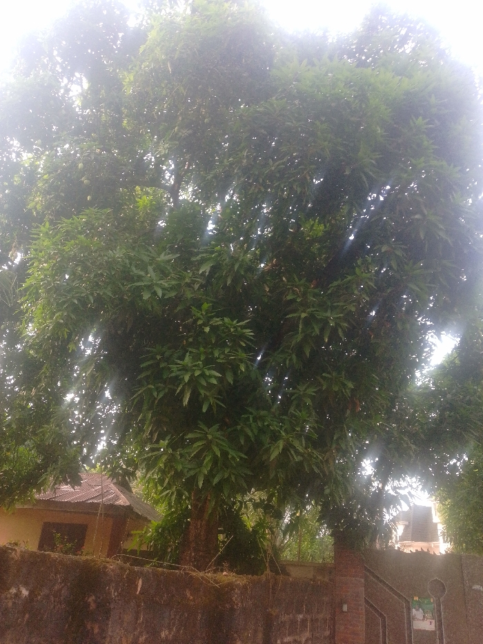 A large, leafy tree dominates the scene, its branches heavily laden with green foliage. Sunlight filters through the leaves, creating bright spots. Below the tree, a weathered wall runs across the bottom of the frame, with a small building with a brown roof partially visible behind it on the left. On the right, a staircase leads behind the wall. The hazy light suggests a bright day, but the details are somewhat obscured.