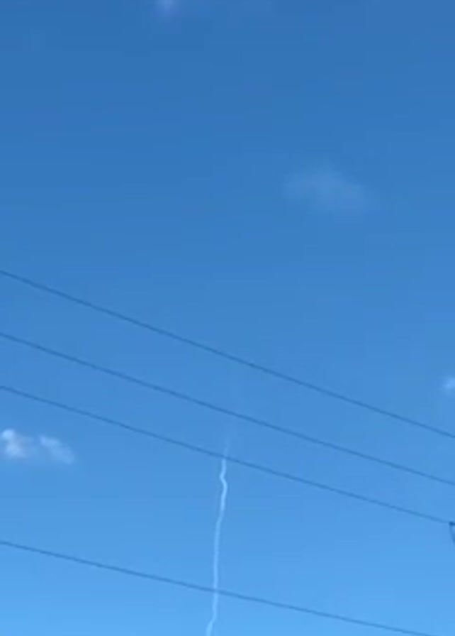 bright blue sky with wispy clouds and a long, thin white contrail bisecting the frame vertically. The contrail appears to originate from a point high in the sky and descends towards the horizon. In the foreground, a series of dark power lines stretch across the bottom of the frame. The camera is positioned at a low angle, looking upward.