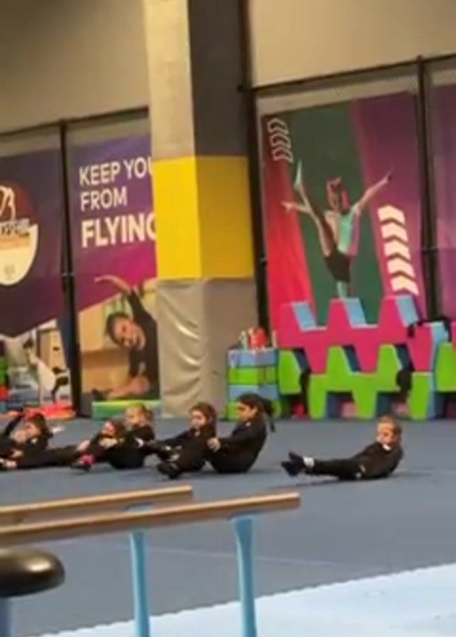 six young girls wearing black leotards doing crunches on a blue gymnastics mat