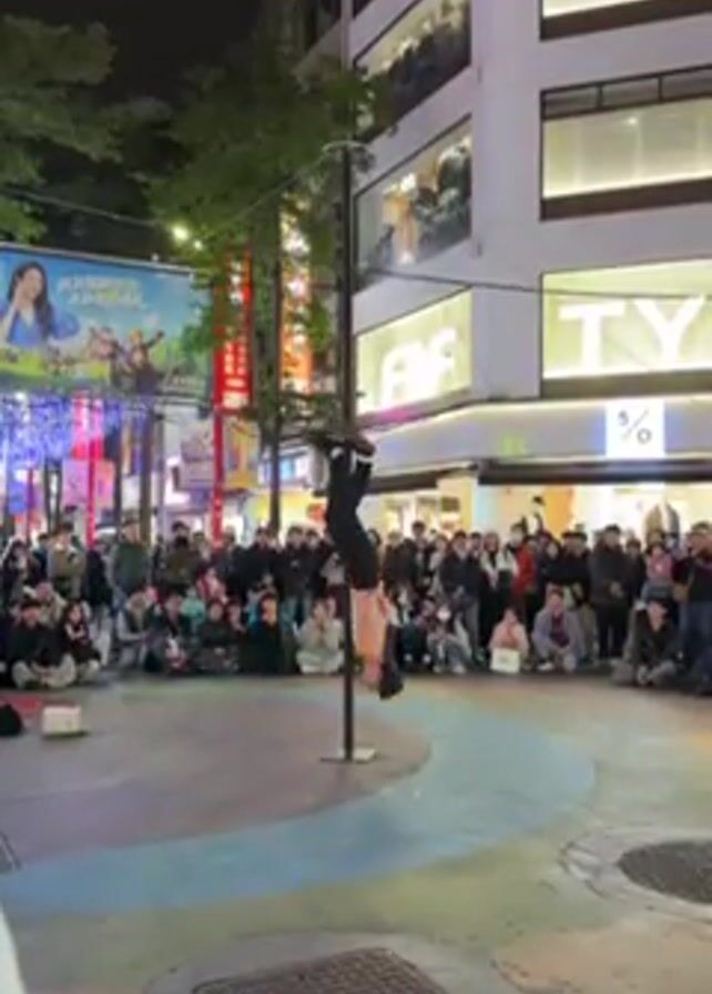The video captures a street performance at night, in what appears to be an urban city square. A crowd of people, mostly dressed in casual winter clothing, sit or stand in a circle, watching a performer balance upside down on a metal pole. The performer's head rests on a small, round platform at the base of the pole, while their legs are extended upwards. Surrounding the performance area are buildings with illuminated signs, as well as advertisements and trees. The ground is decorated with painted, colorful designs. The atmosphere is lively, with expressions of amazement from the audience.
