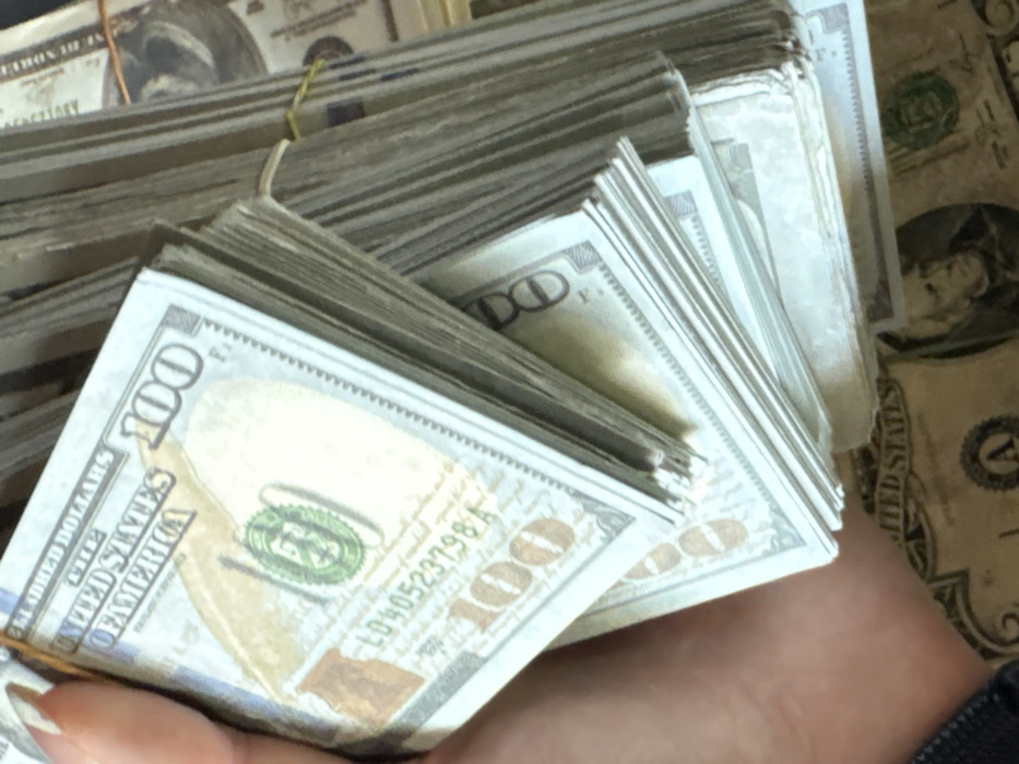 A close-up image depicts a light-skinned hand, with manicured fingernails, holding a stack of new series United States one hundred dollar bills