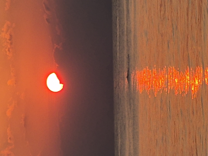 The image captures a sunset scene over a calm body of water in Baan Sri Thanu, Thailand. The sky, predominantly a vivid orange and red, features a brilliant, partially obscured sun positioned in the upper-center, radiating a bright white-yellow light with a strong red halo. Dark, wispy clouds partially cover the lower-right edge of the sun. Below the horizon line, the water's surface reflects the sun's light in a prominent, shimmering vertical column of orange and red, extending towards the bottom of the frame. Subtle ripples are visible across the water, with a distinct, minor swell or wave crest present in the mid-distance slightly to the left of the sun's reflection. No people, man-made objects, or specific actions are discernible within the frame.