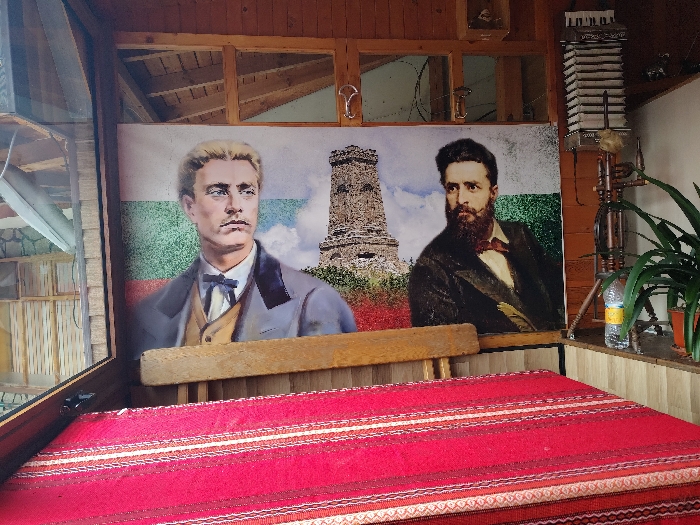 The image displays an interior scene, likely within a traditional establishment in Asparuhovo, Bulgaria. A large, rectangular banner occupies the central background, mounted against a light-toned wooden paneled wall. This banner features two historical figures: on the left, a man identified as Vasil Levski, depicted with light hair, a mustache, a dark jacket, a light waistcoat, and a bow tie; on the right, a man identified as Hristo Botev, with dark hair and a full beard, wearing a dark jacket, a red bow tie, and holding a feather. Between and behind these portraits, the Bulgarian national flag (horizontal white, green, and red stripes) is visible, overlaid by a representation of the Shipka Monument. In the foreground, a wooden table is covered with a red tablecloth, patterned with numerous white and red horizontal stripes, some incorporating intricate ethnic motifs. A wooden bench, its backrest visible, is positioned behind the table. To the right of the banner, on a wooden shelf, a clear plastic water bottle with a yellow label rests beside a decorative wooden object resembling a spinning wheel or distaff. Above this shelf, a vertical, elongated wooden structure resembling a decorative accordion is mounted on the wall. A potted plant with long green leaves occupies the far right of the shelf. The room features walls and ceiling clad in light-colored wooden paneling, with exposed wooden beams visible in the upper sections. A glass pane within a wooden frame is partially visible on the far left, suggesting a window or an entrance to an adjacent area.