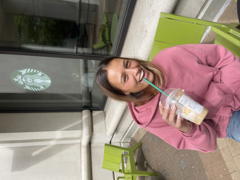 A young adult female is depicted seated outdoors on a lime-green metal chair, on a paved surface next to a building. She is wearing a pink hooded sweatshirt and blue jeans. Her light brown hair, with visible lighter streaks, frames her smiling face as she looks directly at the camera. She holds a clear plastic Starbucks cup, containing a partially consumed iced beverage and a green straw, to her mouth. The cup features a white label with "Lira" handwritten on it and a small golden star decal. A large green Starbucks siren logo is prominently displayed on the glass window of the building behind her, reflecting outdoor elements. The building exhibits light-colored stone or concrete architectural details. This scene is situated in Arlington, United States.