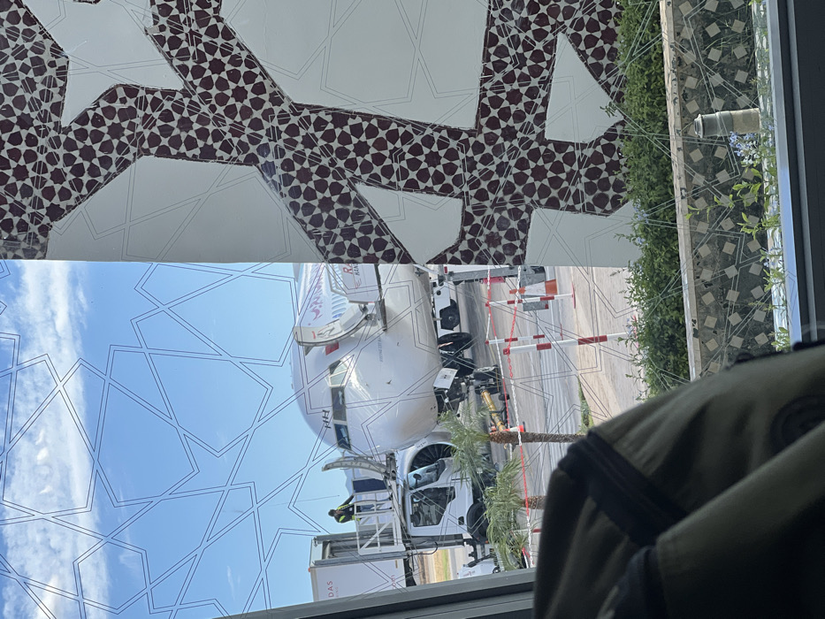 The scene depicts an airport tarmac view from an indoor terminal building in Ouled Tayeb, Morocco, during daylight hours. A white commercial aircraft, identifiable by "QATAR" branding and partial "B777" text, is parked centrally, with its front section and cockpit prominent. A male individual, wearing a high-visibility green/yellow vest, stands on the elevated platform of a white service vehicle positioned near the aircraft's cockpit. On the tarmac, several red and white striped barrier poles are visible, alongside two small palm trees. The environment includes a clear blue sky with minimal cloud cover and distant light-colored hills. The view is partially obscured by a decorative, clear geometric pattern on the window and a large, dark red and white patterned architectural element on the right, which is part of the building's interior or facade. The immediate foreground shows a dark, upholstered object and a planter with green foliage and small flowers.