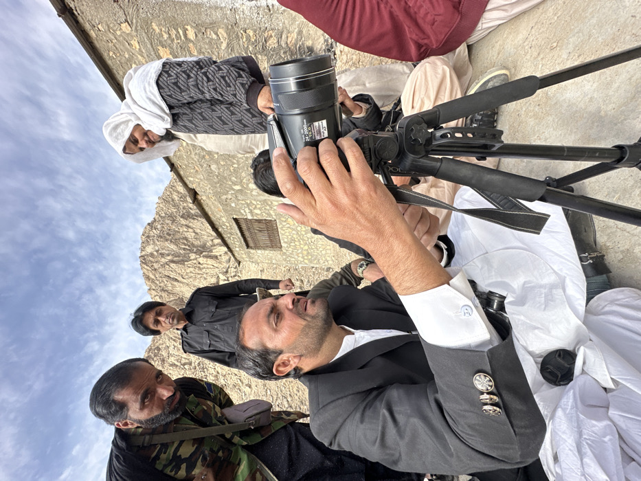 An outdoor scene in Quetta, Pakistan, depicts a group of individuals gathered in a mountainous, semi-arid environment with stone structures. In the foreground, a man with a beard, wearing a black suit jacket over a white shalwar kameez, is seated or crouching, actively operating a black camcorder mounted on a black tripod. His hands are engaged with the camera's body and lens controls, which bear text indicating "24-2000mm 1:2.8" and "Optical 83x Zoom." Cufflinks are visible on his white shirt cuffs. To his immediate right, a portion of another individual wearing a maroon jacket and light-colored trousers is visible. Behind the central figure, a man with a dark beard and camouflage-patterned shirt, carrying a light-colored sling bag, observes the camera setup. Adjacent to him, another man in a black collared shirt stands and watches. On the far right, a person wearing a white head covering and a dark patterned jacket also observes the activity. A partially visible individual with a watch on their left wrist is behind the central operator. The background features prominent, light-colored rocky mountains under a partly cloudy sky. To the right, a weathered stone or mud-brick building with a small, barred window is present. The ground appears uneven and unpaved. All visible individuals are focused on the camera operation.