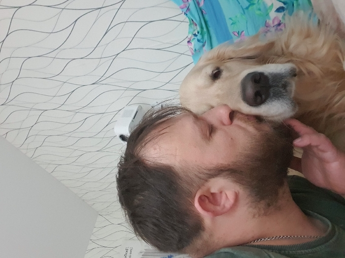 An indoor scene depicts an adult male kissing a Golden Retriever dog within a residence located at Pobolochny Street, Building 1, Chaikovsky, Russia