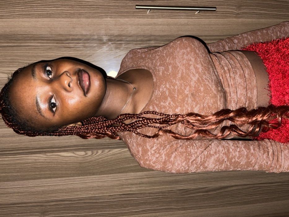 A waist-up portrait captures a young female individual standing indoors. The individual has dark skin, dark eyes with winged eyeliner, and full, glossy lips. Her hair is styled in long, reddish-brown box braids, with some strands ending in loose curls that extend over her left shoulder. She wears a form-fitting, long-sleeved, light brown top with a textured pattern, cropped to reveal a small section of her abdomen. A thin silver chain necklace with a single dark bead or pendant is visible around her neck. Below the crop top, a portion of a bright red, fuzzy lower garment is visible. The individual is looking directly at the camera with a neutral expression. The background features a light to medium brown wooden surface with prominent vertical grain, consistent with a wardrobe or door, and a vertical metallic handle is partially visible on the right side of the frame. The scene is situated indoors, within the city of Unguwar Gabas, Nigeria.